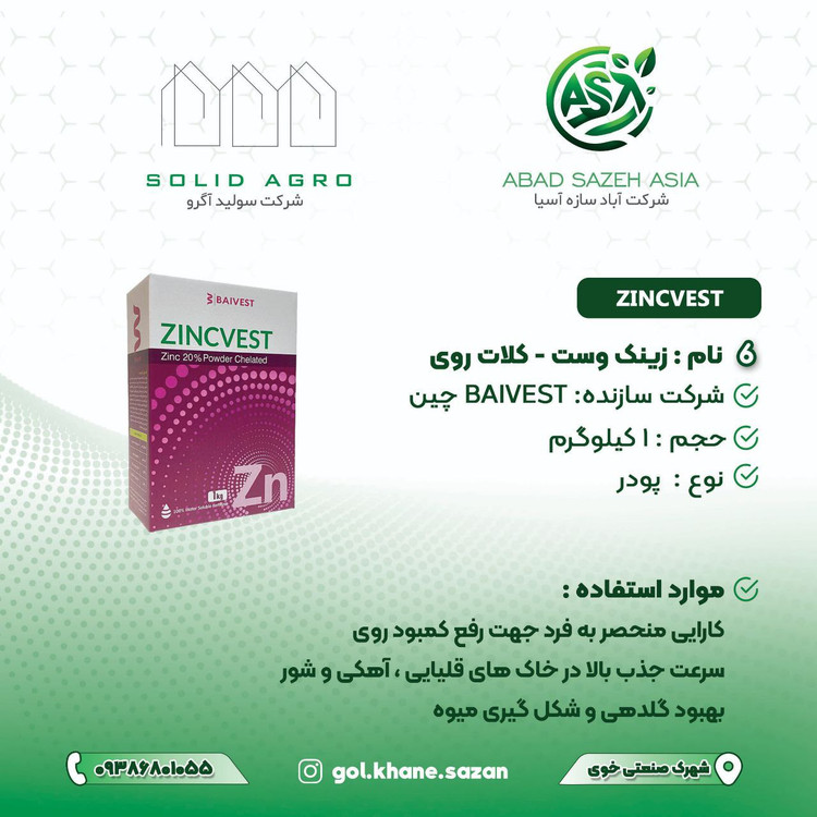 ⭕️کلات ZINCVEST یک کود میکرو یا ریزمغذی است که حاوی عنصر روی (Zn) به میزان ۲۰٪ به شکل کلات شده (معمولاً با EDTA یا سایر عوامل کلاتکننده) میباشد.