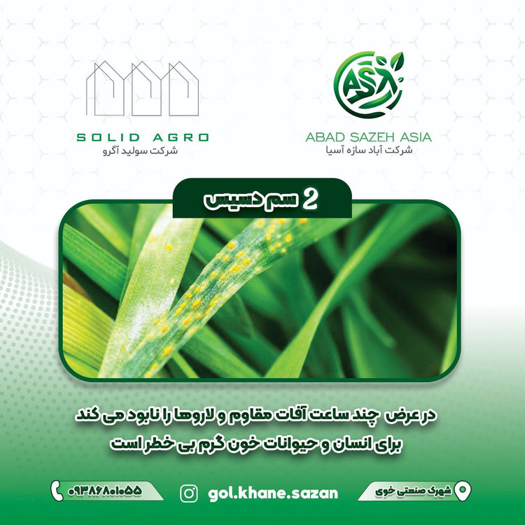 ⭕️ دسیس بوسیله محققین موسسه تحقیقات آفات و بیماریهای گیاهی برای مبارزه با مینوز لکه گرد درختان میوه ، پرودونیای چغندرقند و پنبه و سن گندم توصیه شده است .