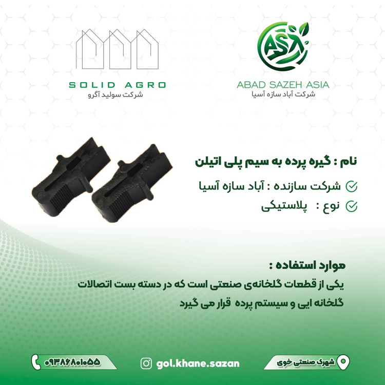 ✅برای اتصال پردههای انرژی سیوینگ در گلخانه به سیم پلی اتیلن، معمولاً از گیرههای مخصوص پرده گلخانه (Curtain Clips) استفاده میشود. این گیرهها وظیفه دارند پرده را به طور محکم و در عین حال قابل حرکت، به سیمهای پلی اتیلن (یا گالوانیزه) که در طول گلخانه کشیده شدهاند، متصل کنند.✅