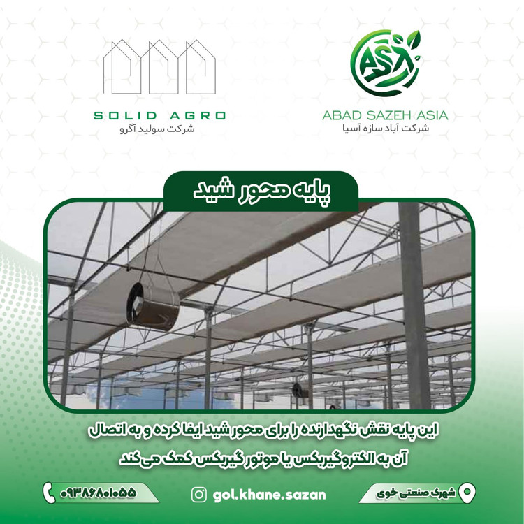 پایه محور شید یکی از قطعات اصلی در سیستم پرده سایهانداز گلخانهای است که برای نصب و نگهداری لولهی گردانندهی پرده (محور شید) استفاده میشود. این لوله معمولاً در بالا یا وسط گلخانه قرار دارد و با چرخش خود، پرده را باز یا بسته میکند.