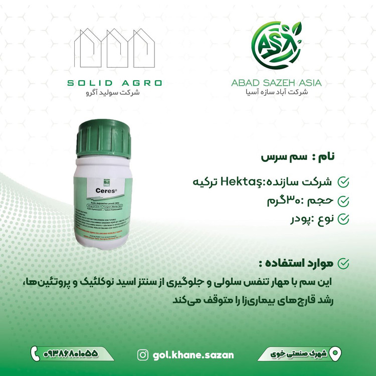 سم سرس (Ceres) یک نوع سم حشرهکش و قارچکش است که برای محافظت از گیاهان در برابر آفات و بیماریهای قارچی استفاده میشود. این سم معمولاً در کشاورزی و باغداری کاربرد دارد و میتواند در کنترل حشرات مکنده، شتهها، مگسها و قارچهای گیاهی مؤثر باشد.