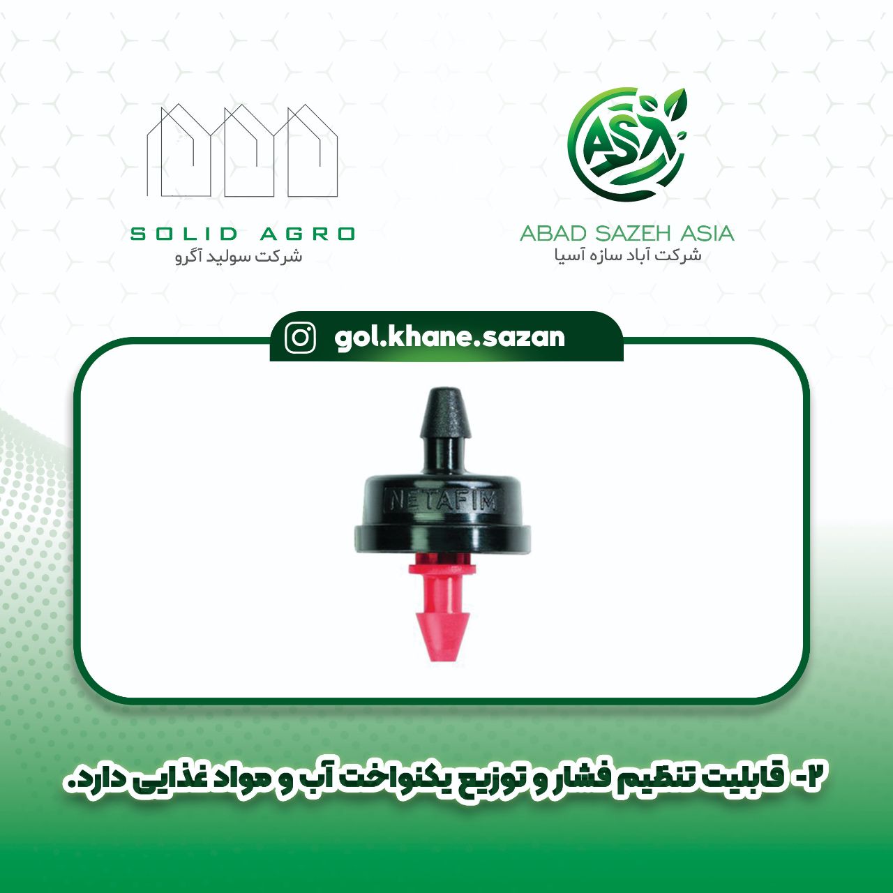 ✅قابلیت تنظیم فشار و آبیاری یکنواخت در سطح مزرعه دارد.