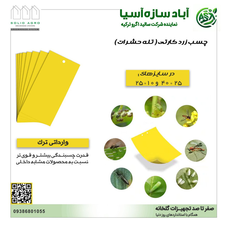 ⭕توجه داشته باشید که استفاده از کارت زرد در عین کنترل جمعیت آفات روشی مناسب برای رصد و ردیابی آفات نیز میباشد. با این حال برای آنکه بتوانید بهترین نتیجه را از کنترل آفات به دست آورید، توصیه میکنیم با کارشناسان شرکت آباد سازه آسیا مشورت کنید تا آنها میزان و نحوه استفاده دقیق از این کارتها را برای گلخانه شما تعیین کنند.