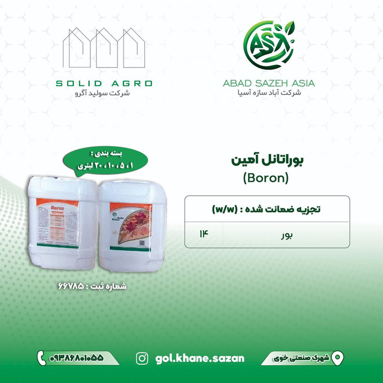 ⭕️کود بور اتانول آمین یک کلات بور است که ترکیبی پایدار از 14% عنصر بور کلاته با بنیان EDTA است که ماندگاری بالایی در خاک های آهکی و قلیایی با pHبالا دارد و به دو صورت محلول پاشی و کود آبیاری استفاده می شود.