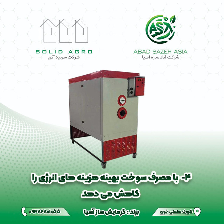 کاربرد: مناسب برای گرمایش فضاهای مختلف مانند گلخانهها، مرغداریها، سالنهای صنعتی و سوله.