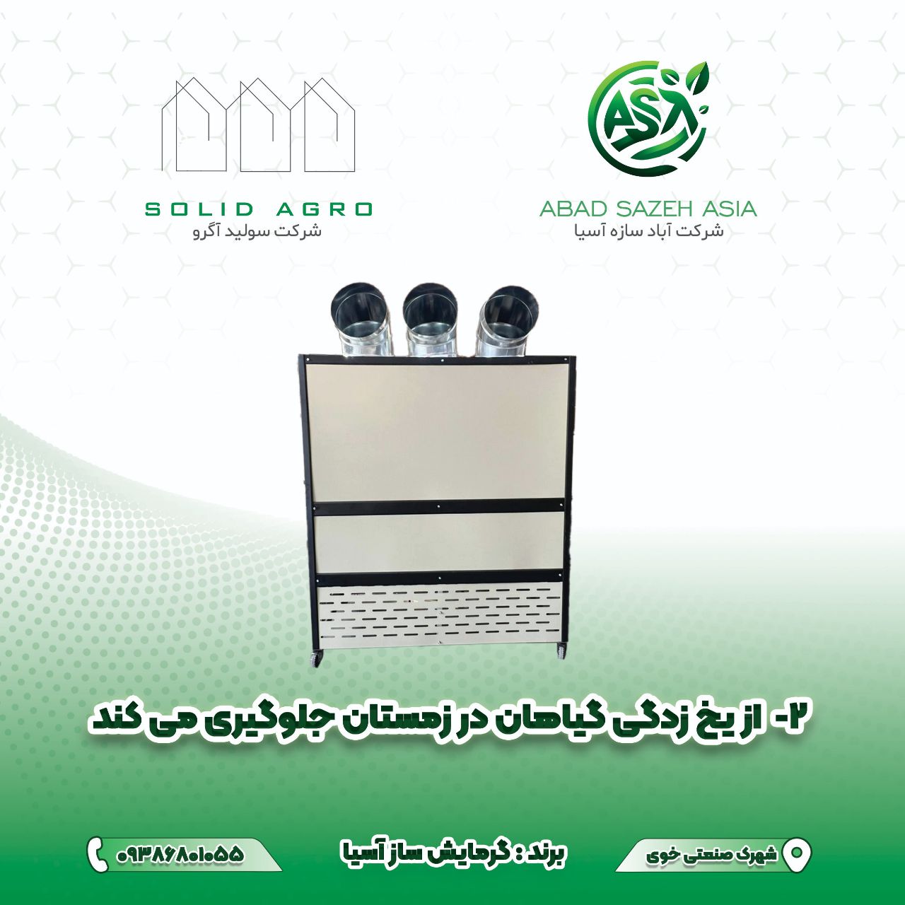 کاربرد: مناسب برای گرمایش فضاهای مختلف مانند گلخانهها، مرغداریها، سالنهای صنعتی و سوله.