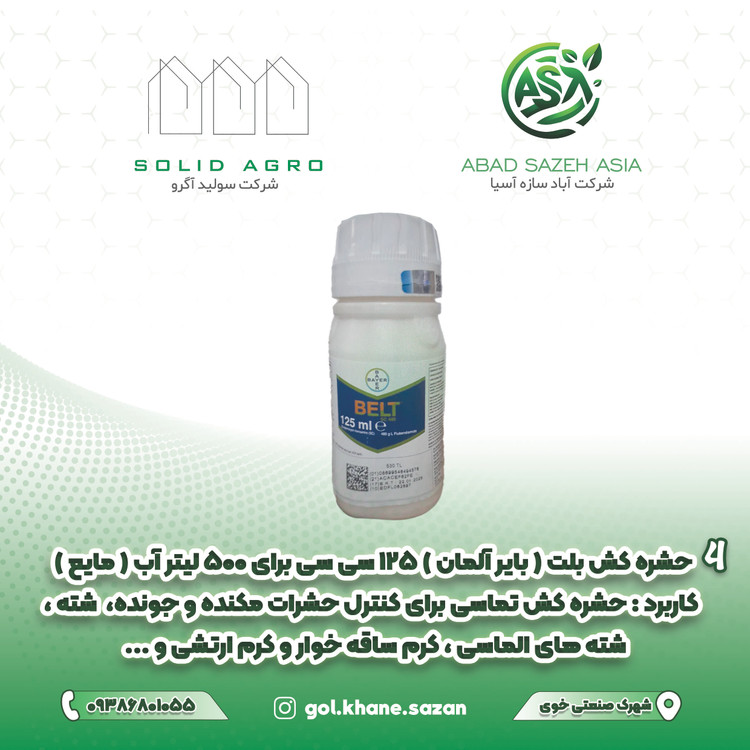 حشره کش بلت بایر آلمان 480گرم در لیتر فلوبن دیامید یک حشره کش تماسی برای کنترل شب پره و شته های الماسی در کلم و کلم پیچ، حشرات مکنده و جونده در لوبیا و گوجه فرنگی، شته، تریپس و مگس سفید در گل رز، شته در گندم و جو، کرم ساقه خوار ذرت و کرم ارتشی در ذرت.