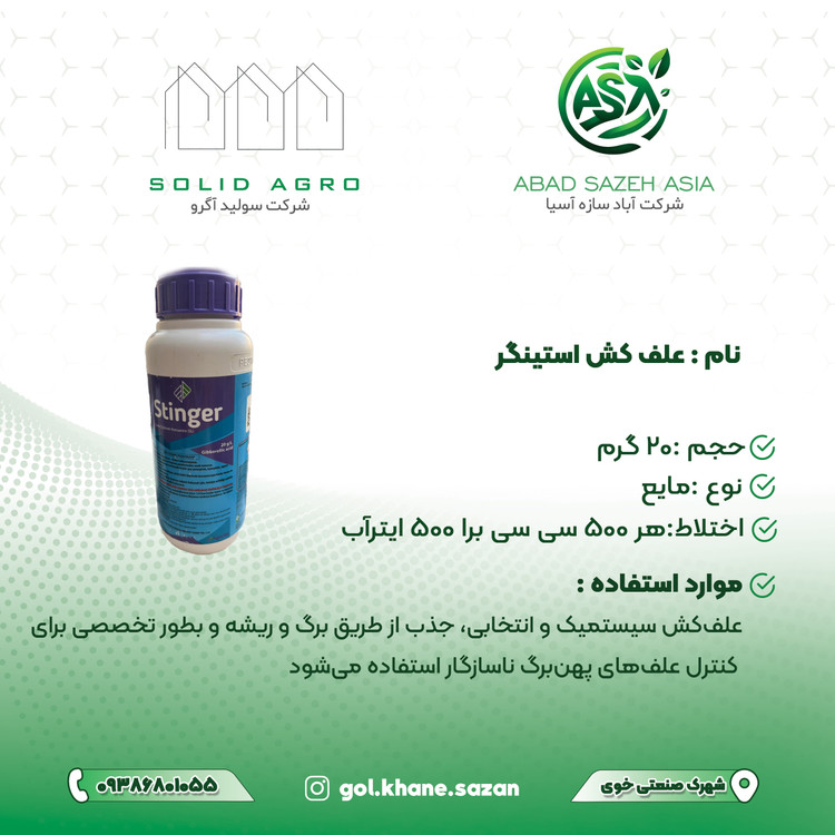 سیستمیک و مؤثر؛ علفهای پهنبرگ را از ریشه نابود میکند/استینگر، انتخابی برای کنترل علفهای هرز بدون آسیب به محصول/اثر سریع و کامل روی علفهای هرز پهنبرگ/از برگ تا ریشه، توقف رشد علفهای هرز با استینگ