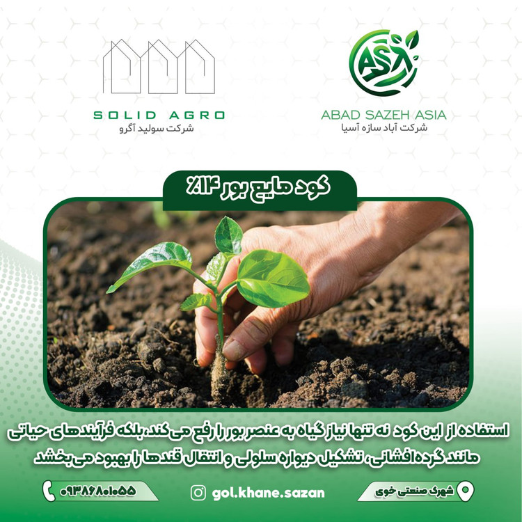 کود مایع بر 14% یک کود ریزمغذی است که به طور خاص برای تأمین نیاز گیاهان به بور طراحی شده است. بور یکی از میکروالمانهای ضروری برای گیاهان است که نقش مهمی در بسیاری از فرآیندهای متابولیک و رشد گیاهان ایفا میکند👇🏻